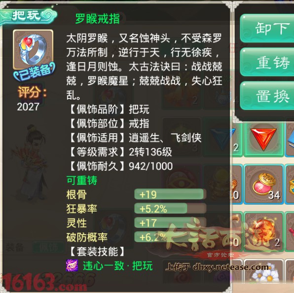 在上周终于凑齐了罗睺把玩套,对于我们大部分的平民敏控制来说罗睺把玩就已经很不错了,因为珍藏需要300点根骨加点,而大部分的平民男人的根骨加点大概在200-250点,基本是体现不出珍藏罗睺套的价值的。这些配饰我都是洗过的,人族的话其实相对魔族来说更加好洗了,因为敏捷和根骨都可以用,而且你的装备根骨要求越大,那么你能承受的装备上的根骨加点也就越多,道理很简单,大家想一下就知道了。这套配饰大概洗了5000W,感觉还是物有所值的。但是配置重铸的费用比较高,还是希望小伙伴们理性对待,自己觉得这么划算这么来吧。