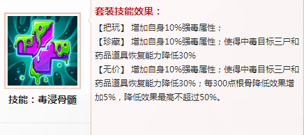 女人的毒伤本来就可以理解为一种负敏状态,最毒女人心吗,这次黯魂套装很好的宣誓了这一特点。黯魂所附带的技能叫做毒浸骨髓,很是贴切的整个套装技能的作用就是削弱中毒状态下的地方单位的补给,而且效果还是很给力的,尤其是削弱30%的药品补给,这可是血法双项的补给虚弱啊,而且无价套随着根骨的增长最多的效果是削弱百分之50,那么基本只要有一个这样的无价女人在场,只要女人出手之后,敏队将会迎来一场痛不欲生的战斗了。不说敏队血队也会深受其害,一个这样的女人配合一个高火力的输出单位,那么对面的补给节奏会完全被打乱,双加药的作用将直接降低到一个异常可怕的程度了。