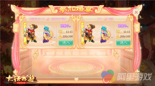 婚宴时间将持续10-20分钟,玩家需要排队入场参与婚宴。活动期间,玩家除了通过造型变换、弹幕留言以及购买烟花礼炮等为新人祝福,更有山贼抢婚、婚礼游街等浪漫玩法邀玩家体验,共同见证情侣玩家的甜蜜爱情!