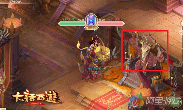 作为魔王窟副本的唯一入口,也是牛魔王汇集众妖魔的地方,“魔王前殿”中王座的平天魂匣包含打开魔王中殿的机关。玩 家只需控制龙神大炮击碎位于牛魔王宝座上方的“平天魂匣”,将牛魔王幻影引出,即可攻入魔王窟的深处。