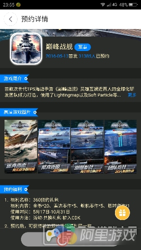 1、进入“360手机助手”,选择“新游”,下拉找到《巅峰战舰》,点击“预约”,即可获得【360预约礼包】。