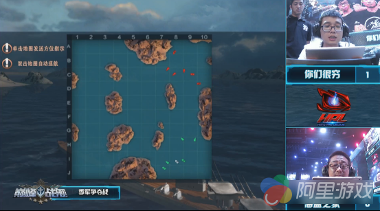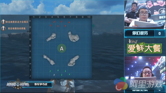 双方开局,蓝方南海舰队选择抱团推进。红方你们很穷选择分散包抄。南海舰队首先拿到1血。之后,双方都选择在双岛之间的海域对射,一段时间后比分变成3:1。随后,红色方选择左侧方抱团,蓝色方绕到岛后海域,比分变成6:4。南海舰队拿下第一分。