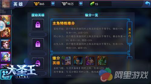 游戏中各个英雄的缘分都不一样,且基本指定某个英雄,唯独主角大圣的缘分比较特殊。主角大圣的缘分属性是同时上阵符合要求的橙色英雄获得缘分属性的加成,适用性很广泛。这里需要知道的是,触发英雄的缘分效果不一定需要上阵,还有助阵或者安排在缘分栏都能触发缘分属性效果。