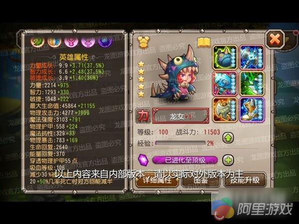龙女作为前排物理英雄,享有多个输出技能,所以她的穿透物理护甲及不俗的吸血显得更加重要,其次 6000+ 的物攻在前排输出英雄中属于佼佼者。配合大招的提升回血速度可以生存的更久,并且反伤给敌人,是一个越战越勇的萌女战士。