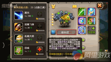 觉醒成功后修补匠开启了觉醒技能回城--修补匠的科技让他可以回城修养一段时间,驱散所有负面魔法并恢复一定状态后回归战场,这个技能需要手动释放(在竞技场中,当修补匠血量少于30%时会自动释放),随着技能等级的提升,回城期间得到的体力恢复量会得到提升。