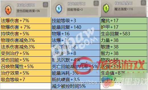 太阳石的属性分配主要是:增加暴击伤害、减免伤害和恢复效果