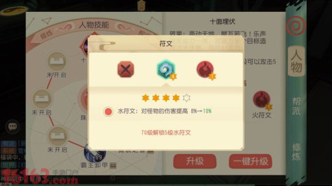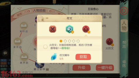 符文的提升:3个符文精华升级1级符文,5个符文精华升级2级符文,8个符文精华升级3级符文,15个符文精华升级4级符文(符文精华可用门派贡献和商城购买)。