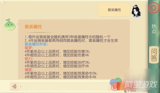 坐骑装备带有随机套装效果,穿戴的4件紫色以上品质装备具有相同属性时,可以激活强化技能的套装效果,提升资质,升级技能,是变强必不可少的途径哦!