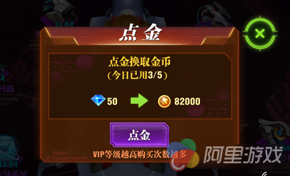 每日可以通过点金功能使用钻石兑换金币,点金过程中有很高几率出现暴击获得大量金币哦!每天有1次免费点金的机会,之后需使用钻石购买,购买次数随着VIP等级越高而增加。