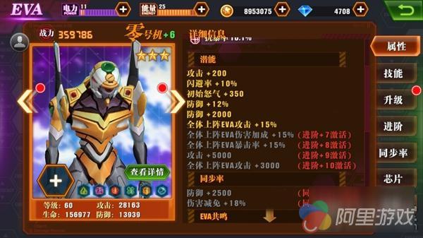 首先来看属性,零号机的防御值是初号机防御的两倍多,并且比 4 星二号机兽化的防御还高将近 5000,可见是多么恐怖的防御能力。零号机的闪避率和抗暴率也是超群的。14.3% 的闪避率和 10.1% 的抗暴率是其他机甲所不及的。初号机的闪避率和抗暴率是 4% 左右,二号机兽化的闪避率和抗暴率虽有所提高,但与零号机相比,还是有很大差距。