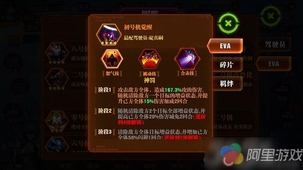在游戏中初号机觉醒的技能以及属性值也延续了动画中的超强战力,从初号机觉醒的技能面板上来说:被动叠加攻击百分比,合击暴击单体,怒气群体攻击+我方增益BUFF+敌方减益BUFF。不愧为当前版本的最强EVA。