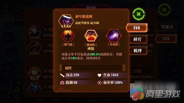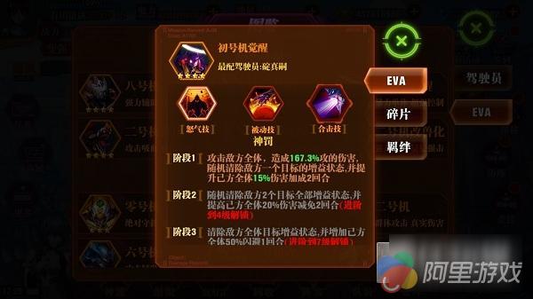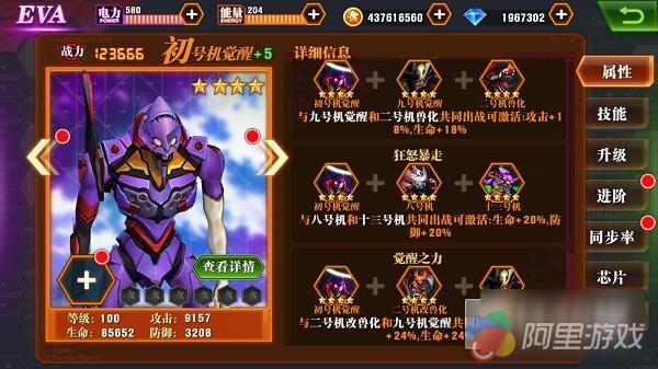 在游戏中初号机觉醒的技能以及属性值也延续了动画中的超强战力,从初号机觉醒的技能面板上来说:被动叠加攻击百分比,合击暴击单体,怒气群体攻击+我方增益 BUFF+敌方减益 BUFF。不愧为当前版本的最强 EVA。