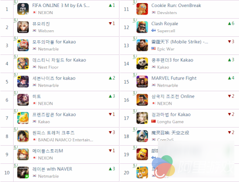 目前进入前十的游戏已经被日本公司和韩国公司包揽,从数量上来看,韩国公司占6款,日本公司占四款。但是前二十之内就有所不同,Supercell的《皇室战争》目前排在第十二,第十三位则是美国MZ出产的《雷霆天下》,国产自发行游戏也有一款在榜,龙图的《剑与魔法》目前排在第十七位,Kakao代理的《功夫熊猫3》排在第14位。