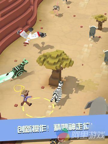游戏采用的是方块像素风格的画面设计,在游戏中玩家扮演的就是一个典型的西部牛仔,在游戏中角色将骑着动物不断向前奔跑,而一路上除了各种障碍物之外,玩家还会遇到许多动物,而利用手中的绳子玩家可以捕捉这些动物。玩家可以骑的可不仅仅是马,公牛同样是可以用来骑的,不过公牛可不愿意让人这么骑在身上,所以玩家需要在公牛发怒之前,跳到其他的公牛身上继续骑行。