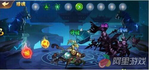 在猎魂的场景中一共有5名魔化的武将,分别为许褚、贾诩、孙策、关羽和吕布,挑战难度逐级递升。成功的挑战了魔化武将成功之后,便可以进行对应级别的猎魂,越高级武将将会产出越高品质战魂。
