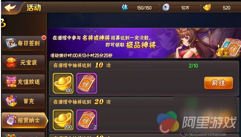 参加游戏活动可以获得充值、招纳贤士以及等级礼包等。