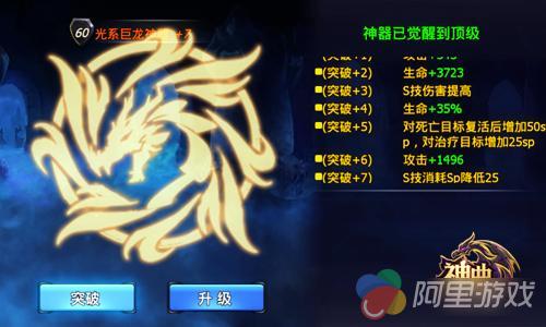 【光明龙神烙印-神器霸气天成】圣光巨龙的神器烙印,是由淡金色魔纹所组成的一个龙形图腾,威武的龙头居中,霸气天成。作为《神曲之符文英雄》中的橙色魔灵,圣光巨龙神器突破可以达到+7,在突破时技能和属性会获得大幅增强。比如+5时龙魂复活目标会额外增加50sp、+7时S技能的消耗SP降低25等等。