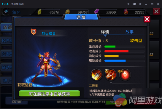 对于烈火精灵,她的所有技能几乎都是攻击式的,非常猛烈,毕竟大家提起火,总觉得会很激烈、很燃,没错,烈火精灵就是一个这样的魔灵角色,对于敌人,百分之百地置于死地、不留余地。她的S级技能是二连射,对地方后排单体造成巨大的魔法伤害,附加无视攻击目标防御的几率。包括她的随从技能,也是为随从魔灵增加攻击,实在是一个猛角色。