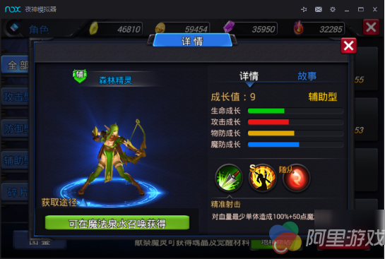 森系魔灵——森林精灵,通体绿色,非常小清新的角色,手里的木质弓箭也非常结实,这可是真材实料的武器。她的S级技能是艾露恩祝福,听起来非常有爱的一个技能,没错,为己方全队增加防御强化效果,持续两个回合。她的随从技能是给随从魔灵增加法防、物防。也是一个非常全面的角色。