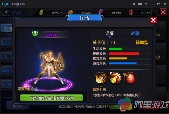 辅助性光系魔灵——光精灵,一位非常非常非常美丽的女神级别精灵角色,通体金色,微光发亮,白色着装,金色镶嵌蓝色宝石的弓箭武器,让人流连的美色,却让人不敢靠近。她的S级技能是神圣光剑,虽说是“神圣”,却是名副其实的剑,打得非常疼,对同列敌人造成巨大的伤害,并附加弱化敌人的防御效果,持续两个回合。随从技能是增加物防,可以说是一个非常全能的角色,而且非常美貌。