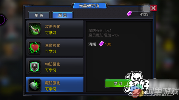 光能研究所中一共有六个技能可以学习分别为攻击强化、生命强化、物防强化、魔防强化、暴击强化、格挡强化。