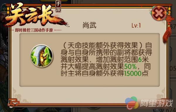关羽化神后获得化神技能“尚武”,技能特效:(天命技能额外获得效果)自身与自身所携带的副将都获得溅射效果,增加溅射范围6米并大幅提高溅射效果50%,同时主将自身额外获得15000点普攻穿透值,持续8秒。