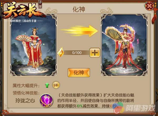 美艳特效加上倾城外观,让化神后的貂蝉成为女武将中最为杰出的代表,让人心生怜悯的同时又不忘她也能和其他魁梧的男武将一样征战沙场,化神技能更是让玩家的续航能力得到了质的飞跃。