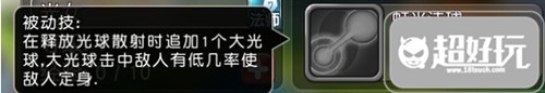 在释放光球散射时追加一个大光球,大光球击中敌人有几率使敌人定身。如同圣堂的紫技一样,给光女瞬间带来一个升华,让她从一个单一的PVE英雄一下子摇身一变成为了PVE和PVP都很强势的英雄。虽然是几率定身,但是一旦定身,对于敌人的影响是十分巨大的。