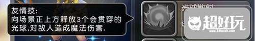 向场景上方释放一个范围爆炸的光球,对范围内的敌人造成魔法伤害。伤害范围较广,但是因为是直线技能,所以很有可能落空。