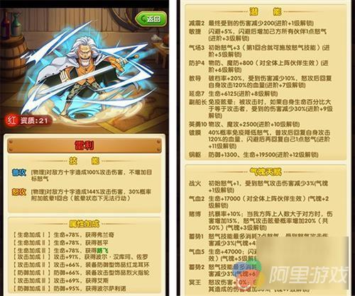 在《航海王强者之路》中,作为拥有资质21的红卡雷利,其普通可对敌方十字造成100%攻击伤害,并且不增加目标怒气。而其怒攻可对敌方十字造成144%攻击伤害,30%的概率附加晕眩1回合,晕眩状态下则无法行动。此外,雷利的属性加成更不容小觑,获得路飞后的可获得78%生命加成,获得艾斯后可带来69%的攻击加成,而波尔萨利诺可带来95%的防御加成。如此可怕的战斗力和属性加成,以及超强潜能和气魄天赋,绝对能让阵容战力分分钟逆天!