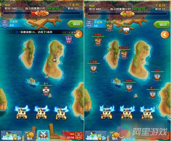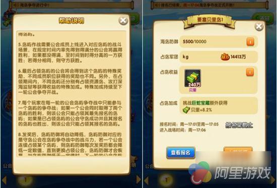 此外,“海岛争夺”战中还拥有丰富的玩法,战场分为左右两条路线,选择其中一条行进路线。主船会根据选择的路线自动开往敌方据点。在行进过程中,如碰到对方船只,则会自动开启战斗。失败公会的那一方船只就会消失,而胜利的一方则可以继续前进,直到失败或抵达最终据点。到达最终的据点会获得一定的分数,最先达到满分的公会获得胜利。若时间结束后,双方公会未达到满分,则得分高者获得胜利。