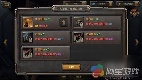 反击:蓝色+2品质激活,受伤10%几率反伤30%,每升1级提高0.5%反伤,满级25级。