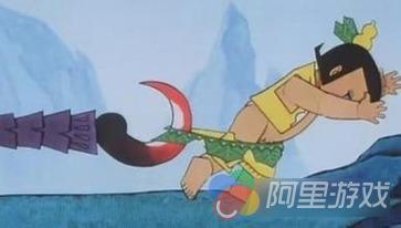 蝎子精延伸尾巴,把要逃跑的三娃钩住。