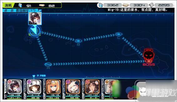 不要带爆轰,就概率到B点,可以省下一次战斗。不过BOSS点有爆轰,看个人选择,也可选带爆轰,boss点会好打一些。不带爆轰就选“分散夹击”的阵型,推荐等级15以上,一样强化主力,带好装备。