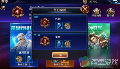 每日奖励包括了宝石和荣誉积分,对应玩家的段位发放。段位越高的玩家,获取的奖励也会越丰厚。