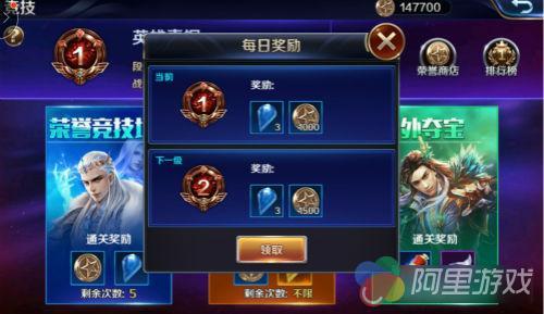 每日奖励包括了宝石和荣誉积分,对应玩家的段位发放。段位越高的玩家,获取的奖励也会越丰厚。