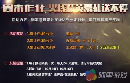 除了两把新武器,各位别忘了还有周末在线得大礼哦!10月14日—10月16日,玩家每日累计在线达到一定时长,即可获得相应奖励。累计在线一分钟都有奖励,累计在线五分钟更有机会获得五星武器(一天)!
