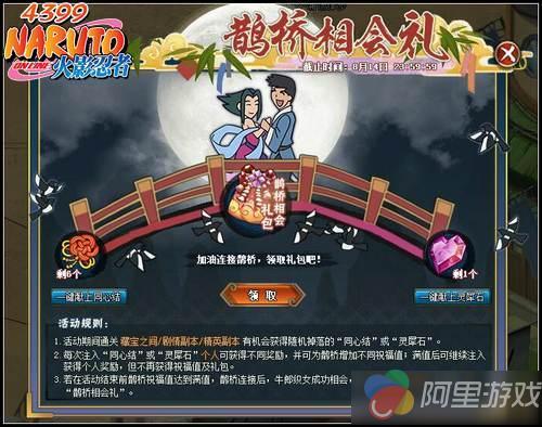 *活动期间通关藏宝之间/剧情副本/精英副本有机会获得随机掉落的“同心结”或“灵犀石”每次注入“同心结”或“灵犀石”个人可获得不同奖励,并可为鹊桥增加不同祝福值。