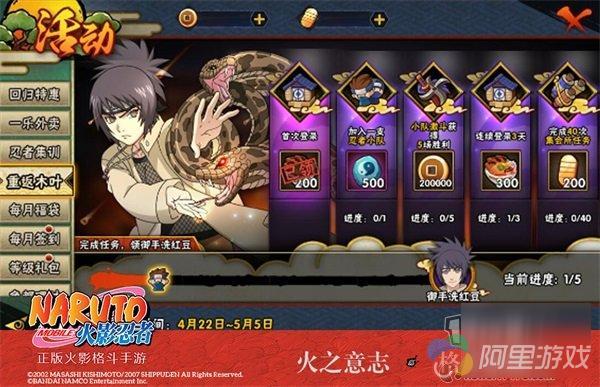 在新版本上线后,符合流失条件的忍者学员只要在“重返木叶”活动期间,每日登录游戏完成指定任务可以获得丰富奖励,完成所有5个任务,可以直接免费获得B级忍者御手洗红豆。