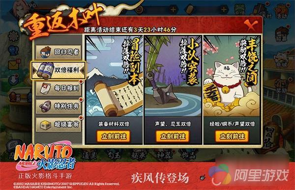 “双倍福利”如疾风般快速成长:符合条件的回归忍者学员,活动期间可获得冒险和精英副本装备材料、小队突袭声望忍玉、丰饶之间经验铜币声望双倍掉落的特权福利,海量成长道具保障,助力学员如疾风般快速成长。