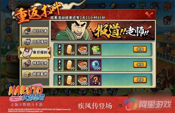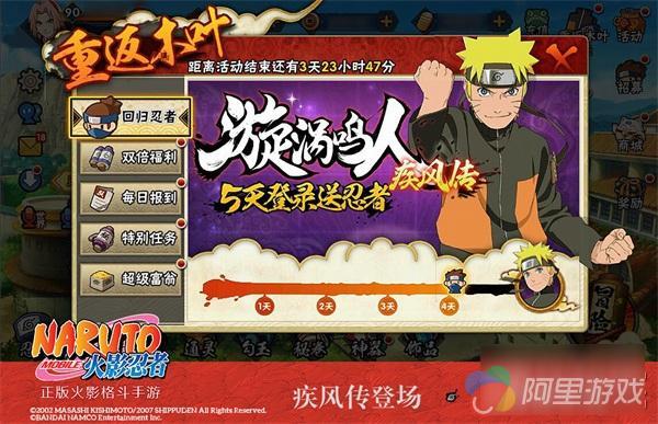 “回归忍者”免费得漩涡鸣人“疾风传”整卡,符合条件的回归忍者学员,活动期间累计登录游戏5天即可直接免费获得火影忍者原著主角漩涡鸣人【疾风传】。