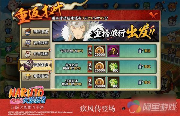 “超级富翁”特别回馈开始!活动期间,回归忍者学员消耗指定金币即可获得金币+声望+神秘忍者的特别回馈,在重返木叶系列活动中获得的金币尽可任性使用,消费更有丰厚回馈。