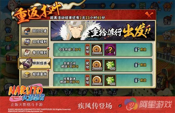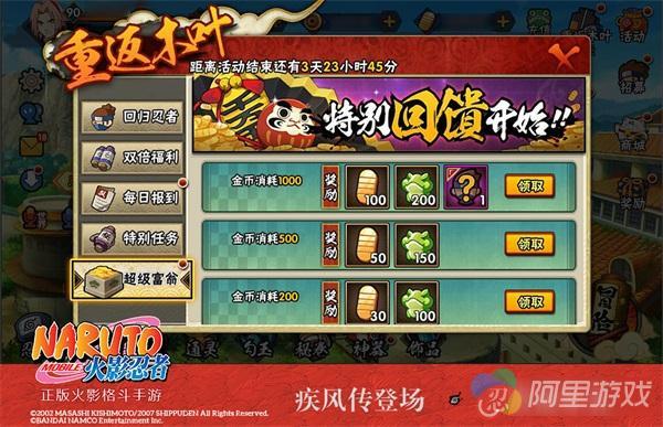 【超级富翁】特别回馈开始!活动期间,回归忍者学员消耗指定金币即可获得金币+声望+神秘忍者的特别回馈,在重返木叶系列活动中获得的金币尽可任性使用,消费更有丰厚回馈!