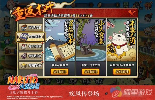【双倍福利】如疾风般快速成长:符合条件的回归忍者学员,活动期间可获得冒险和精英副本装备材料、小队突袭声望忍玉、丰饶之间经验铜币声望双倍掉落的特权福利,海量成长道具保障,助力学员如疾风般快速成长,跟紧主流节奏!