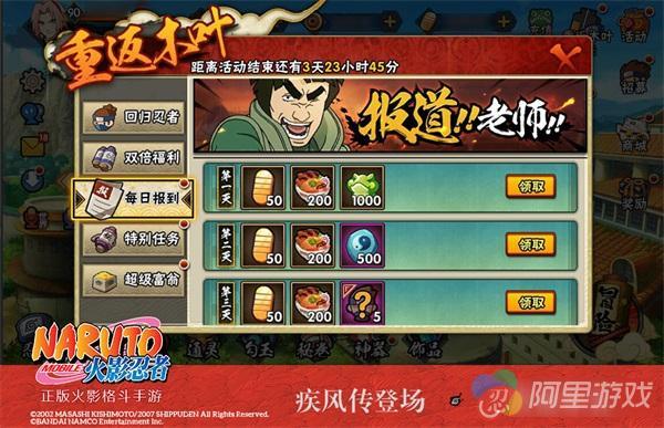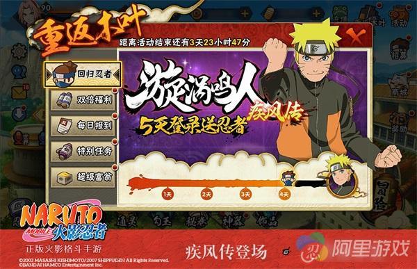 【回归忍者】免费得漩涡鸣人【疾风传】整卡,符合条件的回归忍者学员,活动期间累计登录游戏5天即可直接免费获得火影忍者原著主角漩涡鸣人【疾风传】。