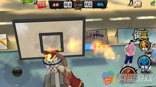 除了普通扣篮,每个球员还可以装备技能,比如小编现在装备的就是大风车扣篮这个技能,可以看到篮球已经变成了火球,快感十足的一球。