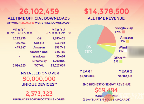 当时公布这部分数据在Ustwo看来只是很小的一件事,但是很快业内就开始讨论这份数据。很多小的开发商联系他们,并感谢他们提供的数据。随后信息图作为一种提供数据的方法被纷纷效仿。于是Ustwo决定再次以信息图的方式公布《纪念碑谷》两周年的一些数据。