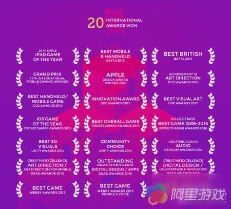 最后,这两年间《纪念碑谷》一共斩获 20 个国际性奖项,其中包括“2014 年 iPad 年度游戏”、“英国学院奖 BAFTA 2014 最佳移动游戏”、“2014 苹果设计奖”、“2014 年 DICE 最佳艺术制作奖”、“GDC 2015 最佳移动游戏”等颇具分量的游戏奖项。同时,《纪念碑谷》还获得了超过 43 个奖项的提名。