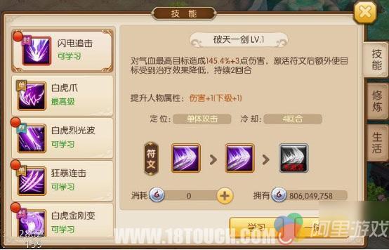 【破天一剑】单体技能,冷却4回合。对气血最高的目标造成若干伤害,并使目标受到的治疗效果减弱。持续2回合。