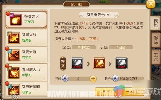 【凤凰穿云击】单体技能,冷却3回合。对前方单体造成伤害,若目标处于灼烧状态中,则伤害提升3 0%